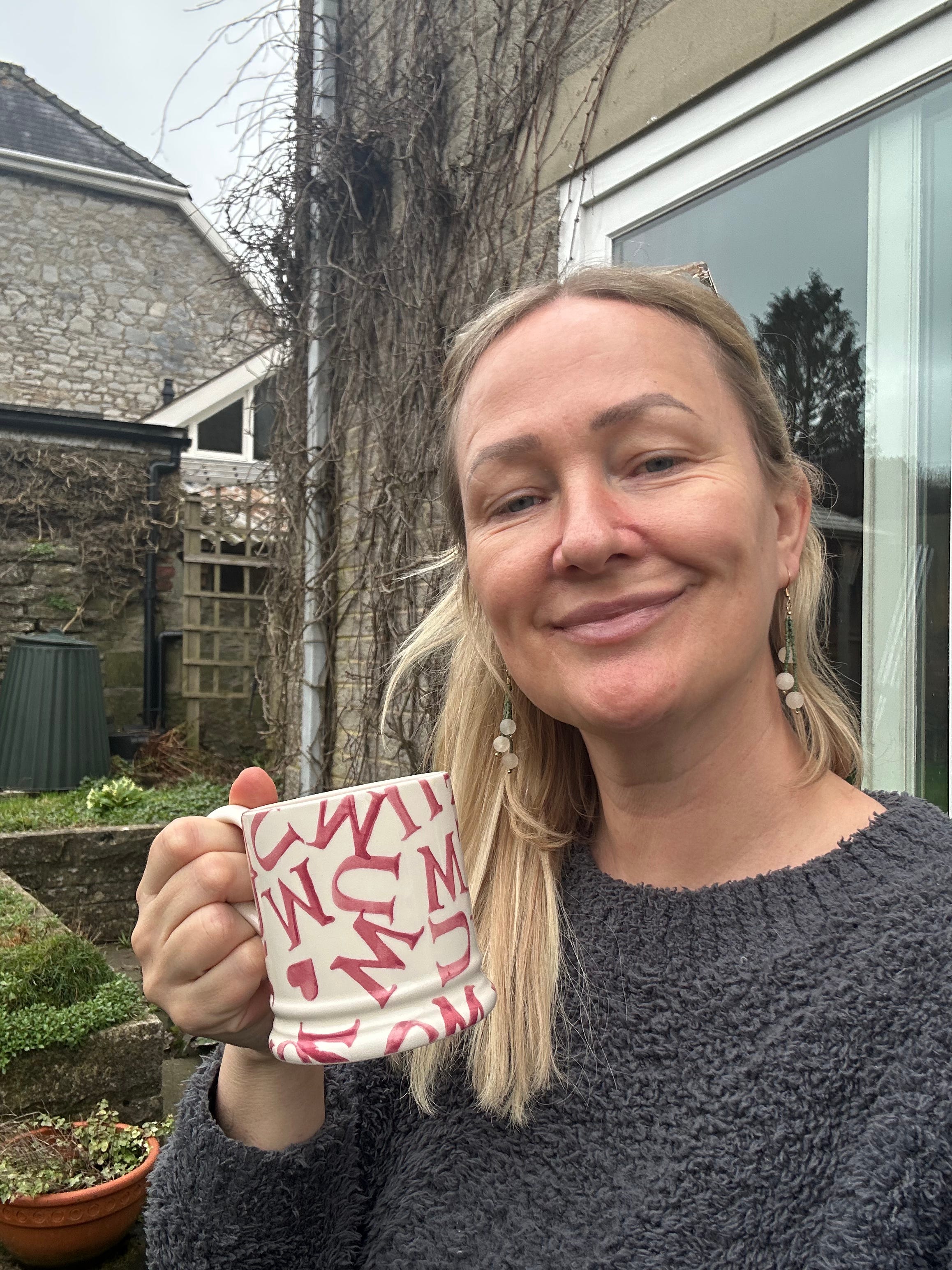 Pictured: me sat in the garden at my new house having a cuppa!