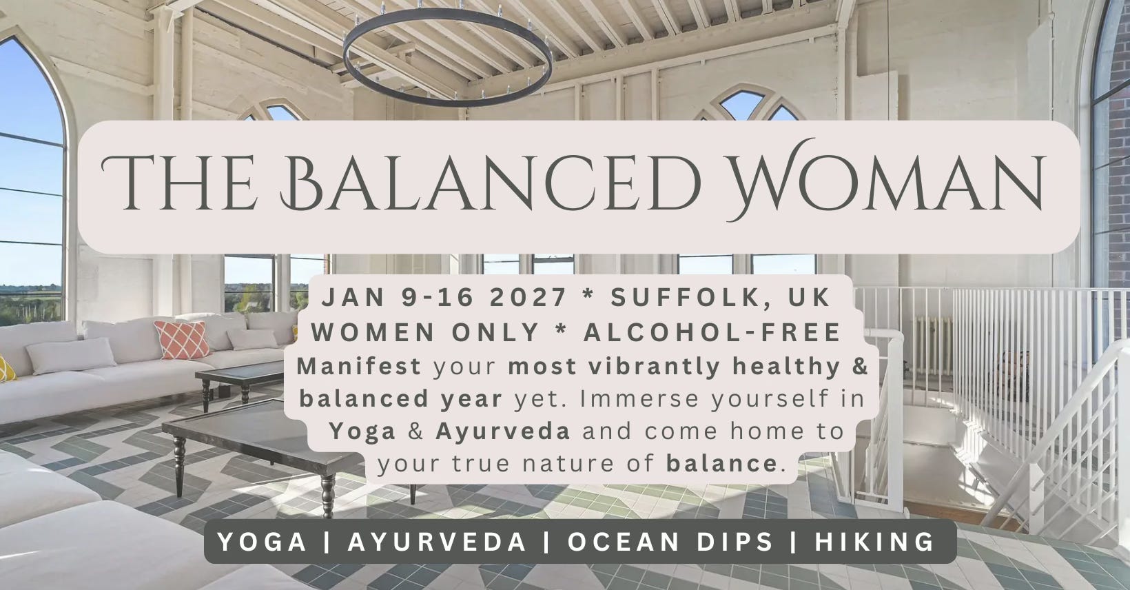 I am still running (universe willing!) a yoga and Ayurveda retreat in Suffolk Jan 2027: daily cold ocean swimming, Ayurvedic chef, hikes, yoga circles and so much more. Amazing quirky house just a stone’s throw from the beach. Email me if you are interested. Early bird pricing: £2130 for a single room with your own bathroom. Payment plan available. Link here that will expire at the end of the month I will pop a page up to replace the website one, so if it’s broken please email me: Rachel.cummins@gmail.com